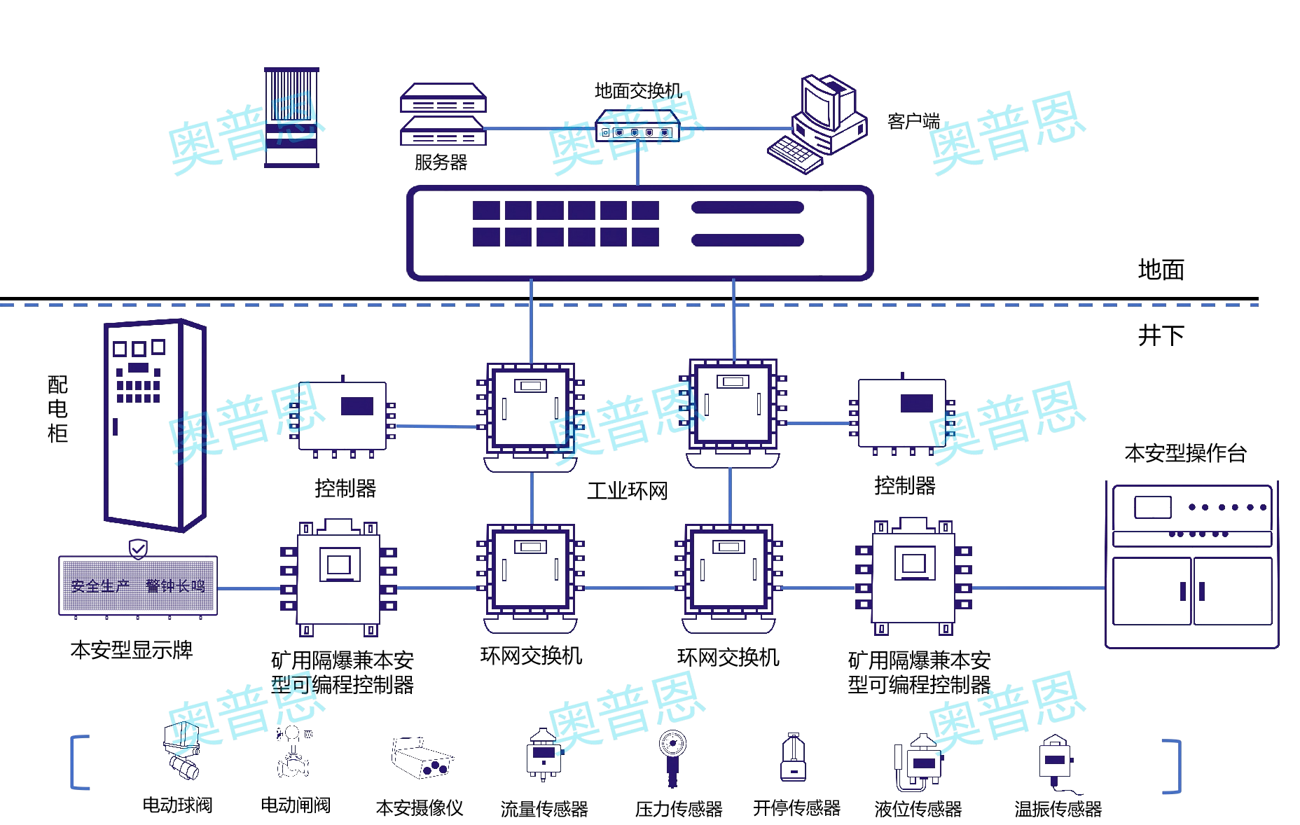矿用智能化排水监控系统适用于矿山井下,特别是煤矿,对排水系统进行集中监测和控制。系统采用可编程控制器为控制核心,通过各种先进可靠的传感器、保护装置、电动执行器等监测排水系统各设备的工作状态。系统实现井下水泵排水系统的自动控制,使水泵排水系统安全可靠、节能高效、经济合理地运行,从而实现了减人增效、安全生产的目的。