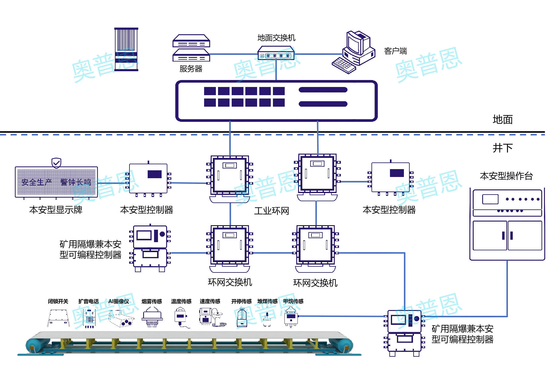 矿用皮带运输监控系统适用于矿山井下,特别是煤矿。系统以可编程控制器为控制核心,对单条或多条皮带机组成的运输系统及其相关设备进行集中监测和控制。系统具有保护、控制、语音通讯、视频监控等功能。