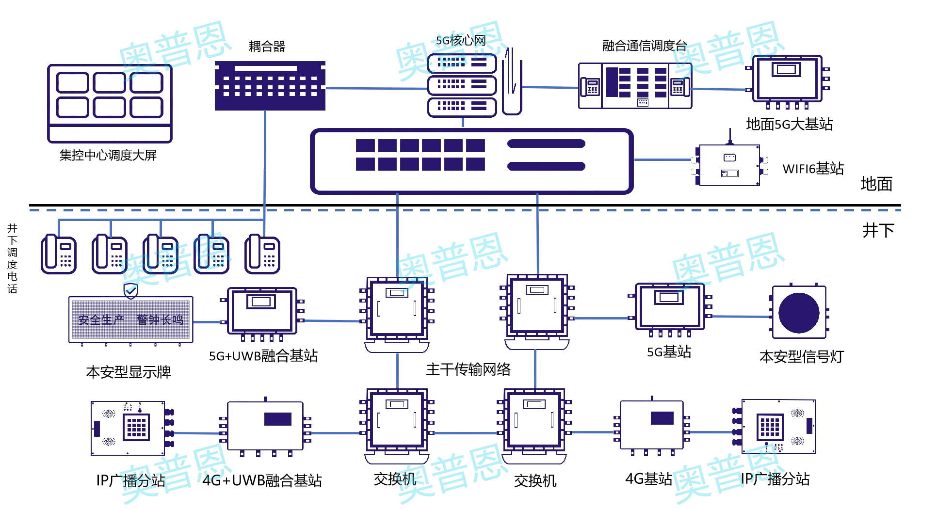 系统支持多种组网模式,具备5G高低频混合组网能力,可有效解决井下大带宽需求与信号覆盖范围小的问题,可实现5G VoNR通话,均具备组呼、全呼、强拆、强插等完整调度功能。系统采用”三融合“设计理念,大大降低矿方的建设成本。